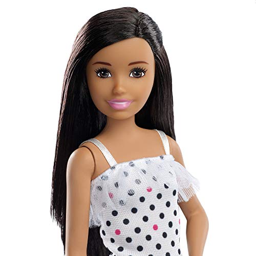 Die Babysitter-Puppe trägt ein Polka-Dot-Oberteil mit hauchzarten Rüschen und einen Jeansrock; blaue Schuhe runden den Look ab