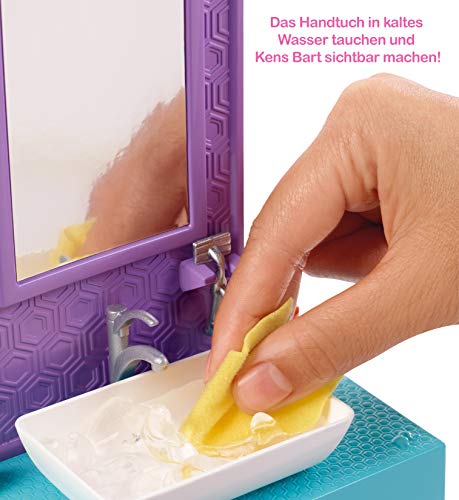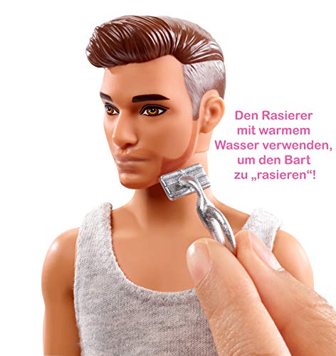 Das Rasierspaß Spielset enthält was auch immer, was Ken zum Rasieren braucht. Mit Ken-Puppe, Möbel und Zubehör. Die Ken-Puppe zum Rasieren besitzt eine Farbwechsel-Diagramm, die Kens Bart erscheinen und fortgehen lässt. Inklusive Rasierschwamm und Handtuch für tolle Rollenspiele. Zusätzliches Zubehör erweitert die Spielmöglichkeiten. Einige Teile verfügen über Griffe, sodass die Puppe sie halten kann. Für Spielspaß und leichte Reinigung. Mit diesen Ken-Puppen macht die Hausarbeit Spaß, denn beim Spielen mit Barbie können Kinder in ihrer Fantasie was auch immer sein. Ken-Puppe mit Mode und Schuhen, Waschbecken, Rasierer, Handtuch und zwei Fläschchen. Die Puppe kann nicht von einzig stehen. Abweichungen in Farbe und Gestaltung vorbehalten.