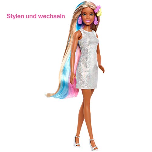 Per den enthaltenen Haargummis darüber hinaus zwei Haarspangen lassen sich Barbies lange braune Haare Per bunten darüber hinaus glitzernden Strähnen zu einer fantasievollen Frisur stylen!