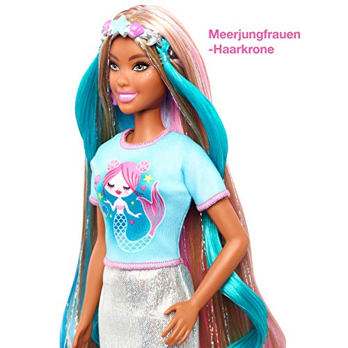 Kinder können die Barbie-Puppe in eine Meerjungfrau verwandeln, indem sie ihr das T-Shirt mit Aufdruck anziehen und ihr den Haarreif mit Seestern, Muscheln und zwei türkisfarbenen Extensions aufsetzen.