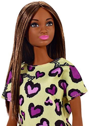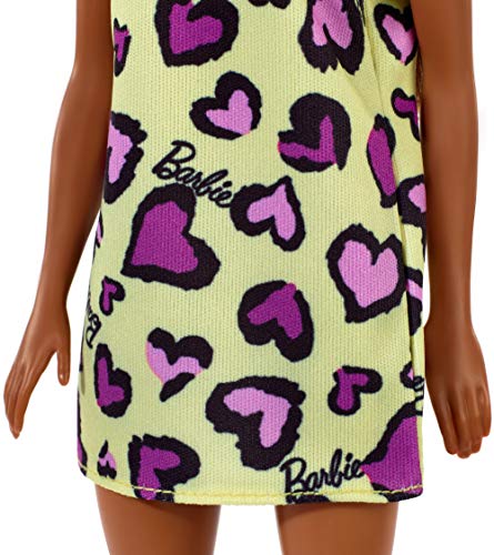 In ihrem vielseitigen gelbem Kleid mit trendigem Herzaufdruck in verschiedenen Lilatönen ist die Barbie-Puppe für die Gesamtheit bereit!