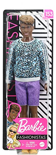 Die Ken-Puppe hat einen breiteren Körperbau als die klassische Puppe und trägt einen türkisen Pullover mit Leopardenmuster und lila Jeansshorts.