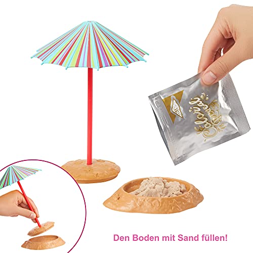 Die Überraschungstüten enthalten übrige Teile: 1 Tintenfisch, 2 von Erdbeeren inspirierte Outfits, ein ansteckbares Pferdeschwanz-Haarteil und übrige Zubehörteile zum Thema Sonne, als ein Sonnenschirm, ein Sandkasten und Sand!