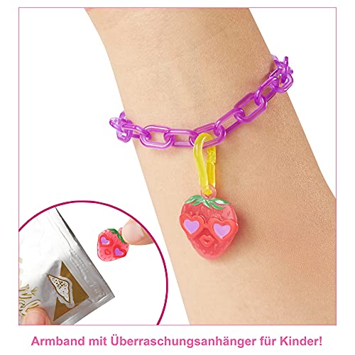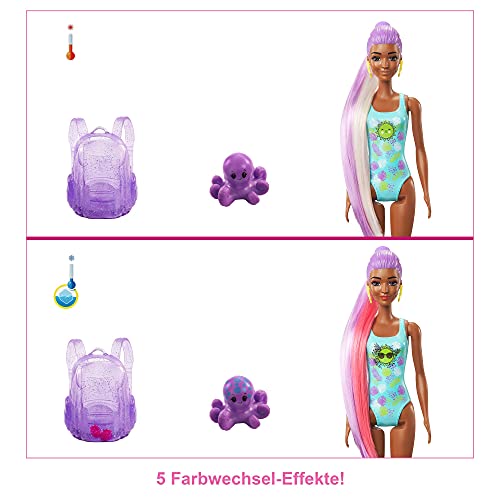 Kinder werden die Barbie Color Reveal Puppe mit 25 Überraschungen und nach Erdbeere duftendem Schaum lieben! Enthalten sind eine Color Reveal Barbie Puppe, ein Tierfreund, 2 vollständige Outfits, 5 Farbwechseleffekte, Sand und ein Armband für Kinder mit einem Anhänger in Form einer Erdbeere.