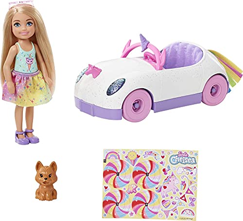 Mithilfe der ca. 15 cm großen Chelsea-Puppe, ihrem Hündchen ebenso dem niedlichen Einhorn-Auto können Kinder spannende Ereignis erleben.