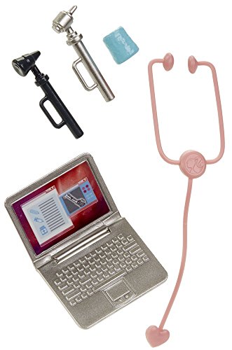 Enthält Barbie-Kinderärztin-Puppe, Untersuchungstisch mit Röntgenbildschirm und Befestigungsmöglichkeiten für Geräte, einen Laptop, Geräte zur Untersuchung der Augen und Ohren, ein Stethoskop sowie eine kleine Patientin mit Mode und Zubehör, z. B. ein abnehmbarer Gips