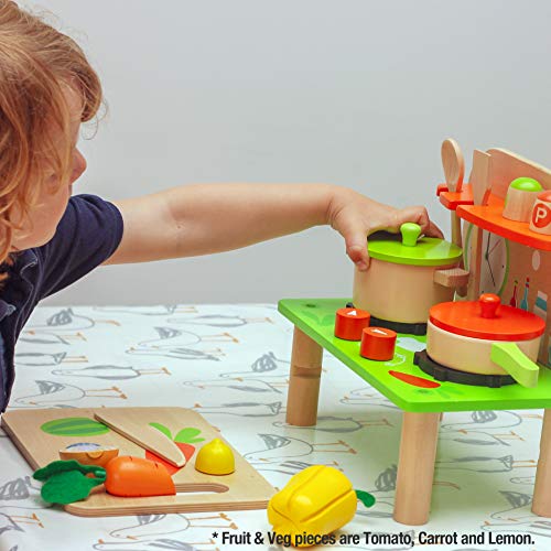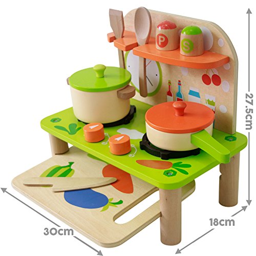 Essen zubereiten Sie mit diesem hellen und farbenfrohen Küchen-Set aufgebraucht Holz und inspirieren Sie frühes fantasievolles Spielen, indem Sie Kindern helfen, das Konzept der „Herstellung“ Essen zum Essen zu verstehen.
