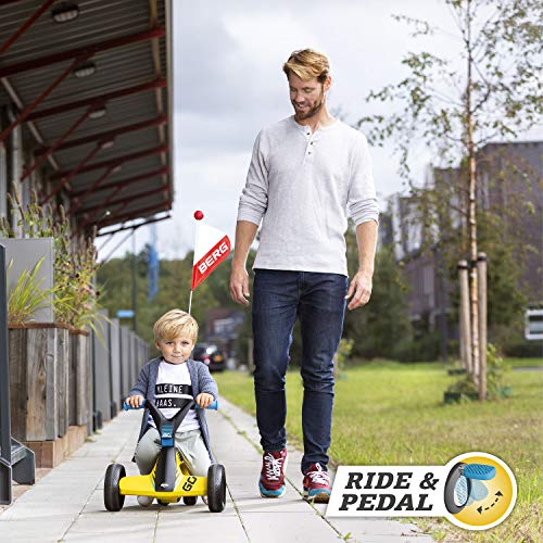 Wenn das Abkömmling das Laufradfahren beherrscht, können die Pedale ausgeklappt werden. Das ist mit einem einfachen Handgriff möglich. Das Abkömmling kann die Füße auf die ausgeklappten Pedale stellen und so das Pedal-Gokart-Fahren üben. Der Anfang ist vielleicht nicht so leicht; dann kann das Abkömmling intermittierend Laufradfahren und Pedaltreten. Da Lenker und Pedale abgekoppelt voneinander funktionieren, behält das Abkömmling immer die Kontrolle über den BERG GO². Mit dem Laufrad- und PedalGokart-Fahren sind die ersten Schritte in der Entwicklung des Kindes getan!