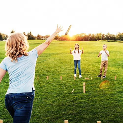 Das Kubb Set umfasst 4 Begrenzungen für das Spielfeld, 6 Wurfstäbe, 10 Holzblöcke und ein König (25cm) ganz robustem Holz