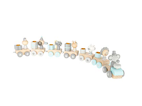 LIEFERUMFANG: 1x Holz Geburtstagszug Scandi-Look Tiere. Bestehend ganz: 1x ‚Lock‘, 6x ‚Waggon‘ mit Kerzenhalter, Zahlen von 0-9, Stecker für die Zahlen. Größe ca. 48x5x7 cm. Gewicht ca. 155 g