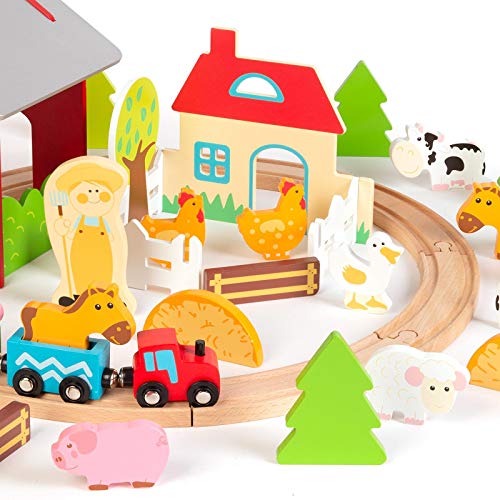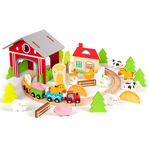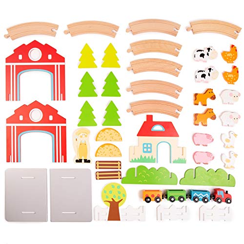 BAUERNHOF-EISENBAHN-SET AUS HOLZ: Ein 45-teiliges Spielzeug-Bauernhof-Eisenbahn-Set von boppi. Dieses Set zugunsten Kinder kommt über einer Sequenz von Zug- ferner Bauernhofzubehör sowie Spielfiguren, um eine unterhaltsame ländliche Umgebung zu bauen.