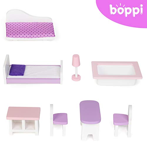 8 MÖBELSTÜCKE ZUM SPIELEN – Das Puppenhaus wird durch den folgenden 8 Zubehörteilen leer Holz zum Spielen geliefert: Küchentisch – 2 Küchenstühle – Badewanne – Chaiselongue – Aufbewahrungstisch – Bett – Stehlampe