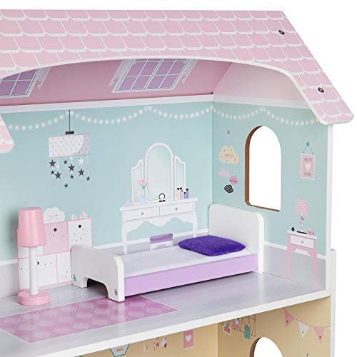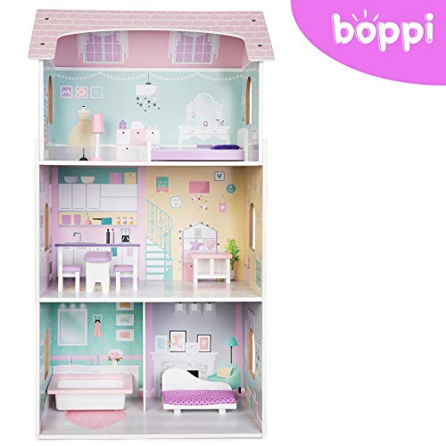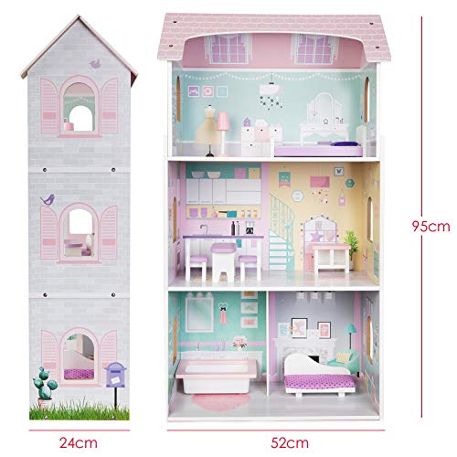 GROSSES DREISTÖCKIGES PUPPENHAUS AUS HOLZ – Ein dreistöckiges Puppenhaus durch 5 Zimmern des Weiteren kleinem Balkon. Hintergründe, Fußböden des Weiteren Wandgrafiken wurden in allen Zimmern detailreich designt. Auf jedem Stockwerk befinden sich 2 Fenster des Weiteren eine frei erreichbare offene Frontseite.