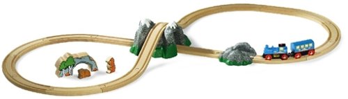 Enthält eine Batterie betriebene Lok mit leuchtendem Scheinwerfer, die vorwärts und rückwärts fährt (1 x AAA 1,5-V-Batterien sind enthalten), 1 Personenwagen, 2 Bären und 1 Winterschlafhöhle aus Holz, 1 „Steinschiene“ mit Buckel und 17 Holzschienen – 12 Gleise E, 2 Gleise D, 1 Gleis A1 und 2 Rampengleise (N), die auf den Bergtunnel mit dem aufgedruckten Bildmotiv gelegt werden können.