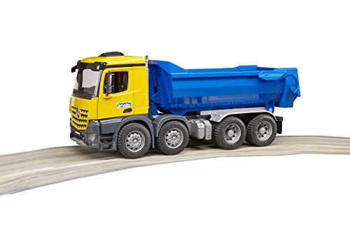Der Mercedes Benz Arocs Halfpipe Kipp LKW aus dem Hause BRUDER, gefertigt im Maßstab 1:16, überzeugt auf Straßen und Baustellen vor allem durch seine Kraft, Robustheit und Effizienz. Das Design des LKW wurde originalgetreu übernommen und dabei wurde reichhaltig Wert auf Details gelegt. So ist z.B. die Front des Kühlergrills in „Baggerzahnoptik“ gestaltet. Das gelbfarbene Fahrerhaus des MB Arocs besitzt einklappbare Außenspiegel und eine Frontscheibe aus transparentem, bruchsicherem Polycarbonat. Die Türen lassen sich beidseitig öffnen, damit auch die BRUDER Spielfiguren einsteigen können. Auch die speziellen Profilreifen sorgen für eine optimale Haftung auf ruppigem Untergrund. Die 3-fach ausziehbaren Zylinder mit Rastfunktion sorgen dafür, dass die Halfpipe Wanne problemlos in 3 Abstufen gekippt werden kann. Die sich öffnende Heckklappe erleichtert das Be- und Fallen lassen. Für einen noch größeren Spielspaß kann der Arbeit mit dem Light und Sound-Modul (Art. Nr. 02801) ausgestattet werden. Das deutsche Familienunternehmen BRUDER Spielwaren zeichnet sich seit der Gründung im Jahre 1926 durch innovative Produkte „Made in Germany“, der Liebe zum Detail und dem Beenden von Kinderträumen aus. Mit Einführung der Kunststoffproduktion wurde der Fort zum heutigen weltweiten Erfolg der Marke BRUDER geebnet. BRUDER verwandelt die erlebte reale Welt in eine originalgetreue Kinderspielwelt. Mit dem pädagogischen wertvollen Prinzip können Kinder das Gesehene aufbereiten und werden spielerisch an die verschiedensten Themen, wie den Straßenbau, die Landwirtschaft oder an Rettungseinsätze herangeführt. Dabei überzeugt BRUDER durch die hohe Qualität und vielseitige Funktionalität seiner Produkte. Die Slogans „auch im Kleinen wie der Große“ beziehungsweise „Just like the real thing“ spiegeln das Leitbild der Firmenphilosophie neuerlich. Die geschaffenen Welten lassen sich durch die maßstabsgetreuen Figuren der B-World Folge (BRUDER Welt) bevölkern und bieten durch den aktiven Einsatz auf Feldern und Baustellen ein grenzenloses Spielvergnügen für Jung und Alt.