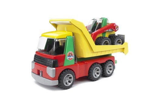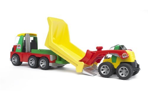 Für den ersten Kontakt mit der riesigen Welt der Lastkraftwagen und städtischen sowie ländlichen Nutzfahrzeugen hat Bruder die robuste Roadmax-Anordnung entwickelt. Diese besticht durch farbenfrohes und kleinkindgerechtes Design, regt die kindliche Vorstellungskraft an und begeistert mit vielen und realistischen Spielfunktionen. Der Roadmax Transporter mit zusätzlichem Kompaktlader führt Kinder ab einem Alter von 2 Jahren spielerisch an die spannenden Aufgaben der Baufahrzeuge heran. Kinder können die transparenten Fahrerhäuser von oben öffnen und einen Blick in die jeweilige Fahrerkabine werfen. Der Transporter besitzt drei Achsen, eine Anhängerkupplung und eine absenkbare Transportplattform mit klappbarer Auffahrrampe. Mit seinem kurzen Radstand ist er extrem agil. Die profilierten Weichreifen sorgen dabei für einen sicheren Stand während der Be- und Entladevorgänge. Das deutsche Familienunternehmen BRUDER Spielwaren zeichnet sich seit der Gründung im Jahre 1926 durch innovative Produkte „Hergestellt in Deutschland“, der Liebe zum Detail und dem Zumachen von Kinderträumen aus. Mit Einführung der Kunststoffproduktion wurde der Verloren zum heutigen weltweiten Erfolg der Marke Bruder geebnet. Bruder verwandelt die erlebte reale Welt in eine originalgetreue Kinderspielwelt. Mit dem pädagogischen wertvollen Prinzip können Kinder das gesehene aufbereiten und werden spielerisch an die verschiedensten Themen, wie den Straßenbau, die Bestellung oder an Rettungseinsätze herangeführt. Dabei überzeugt Bruder durch die hohe Qualität und vielseitige Funktionalität seiner Produkte. Die Slogans „vulgo im Kleinen wie der Große“ beziehungsweise „Just like the real thing“ spiegeln das Leitbild der Firmenphilosophie wiederum. Die geschaffenen Welten lassen sich durch die maßstabsgerechten Figuren der B-World Anordnung (Bruder Welt) bevölkern und bieten durch den aktiven Einsatz auf Feldern und Baustellen ein grenzenloses Spielvergnügen für Jung und Alt.