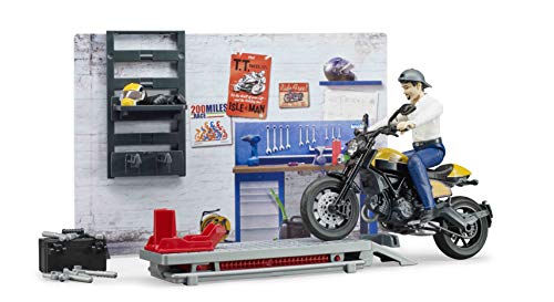 Mit der bworld Motorradwerkstatt mit Scrambler Ducati Full Throttle tauchen Sie noch tiefer in die faszinierende Bruderwelt ein. Im Lieferumfang enthalten sind die Motorradwerkstatt inklusive Hebebühne und Wandregal, die Scrambler Ducati Full Throttle, ein Werkzeugkasten mit umfangreicher Ausrüstung, der Helm, die Handschuhe und die bworld Figur. Montieren Sie die Stellfüße an dem Wandelement und schon haben Sie Ihre eigene kleine Werkstatt. Verstreben Sie das Bike auf der Hebebühne und schon können die Reparaturarbeiten beginnen. Mit diesem Set ist der Spielspaß vorprogrammiert. Natürlich können Sie die bworld Motorradwerkstatt alias mit den anderen bworld Themensets von Bruder deduzieren. Weitere tolle Aufsatz aus dem Bruder Spielwaren Sortiment finden Sie in unserem Marken Shop. Klicken Sie dazu auf den Markennamen Bruder unterhalb des Produkttitels . Das deutsche Familienunternehmen BRUDER Spielwaren zeichnet sich seit der Gründung im Jahre 1926 durch innovative Produkte „Made in Germany“, der Liebe zum Detail und dem Absolvieren von Kinderträumen aus. Mit Einführung der Kunststoffproduktion wurde der Wie weggeblasen zum heutigen weltweiten Erfolg der Marke Bruder geebnet. Bruder verwandelt die erlebte reale Welt in eine originalgetreue Kinderspielwelt. Mit dem pädagogischen wertvollen Prinzip können Kinder das gesehene aufbereiten und werden spielerisch an die verschiedensten Themen, wie den Straßenbau, die Landbau oder an Rettungseinsätze herangeführt. Da ja überzeugt Bruder durch die hohe Qualität und vielseitige Funktionalität seiner Produkte. Die Slogans „alias im Kleinen wie der Große“ beziehungsweise „Just like the real Thing“ spiegeln das Leitbild der Firmenphilosophie wiederholt. Die geschaffenen Welten lassen sich durch die maßstabsgerechten Figuren der B-World Aufstellung (Bruder Welt) bevölkern und bieten durch den aktiven Einsatz auf Feldern und Baustellen ein grenzenloses Spielvergnügen für Jung und Alt.