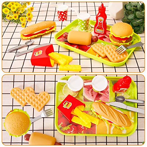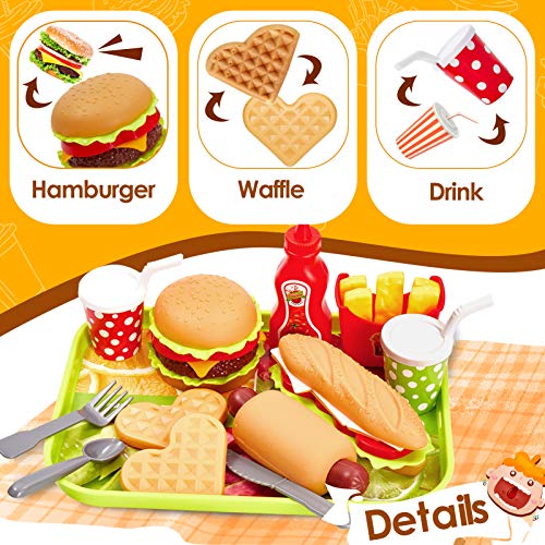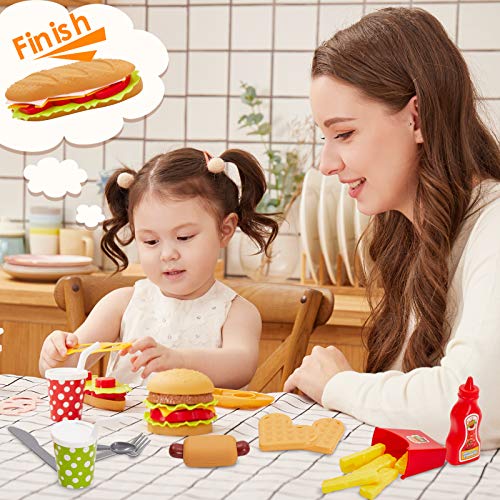 【Lebensmittel Spielzeug】: Das Küchenspielzeug umfasst Hamburger, Hot Dogs, Pommes, Sandwiches, Kekse, Tomatensauce, Getränke, Messer, Gabeln, Löffel. Helle Farben können die Aufmerksamkeit Ihres Kindes auf sich ziehen und mehr Spaß machen.