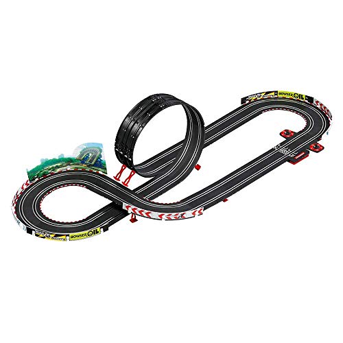 Vollgas mit dem Turboflitzer! Mario und Luigi haben ein neues Rennkart bekommen und sausen mit Highspeed über die Carrera GO!!! Autorennbahn. Die neuen Rennflitzer machen die beiden Brüder noch schnittiger. Auf der 5,3 Meter langen Rennstrecke mit Looping, Fly-Over, Engstelle und Kreuzung ist mega Action garantiert. Bei den kleinen und großen Mario Kart Fans ist neuzeitlich Geschick am Handregler gefragt.