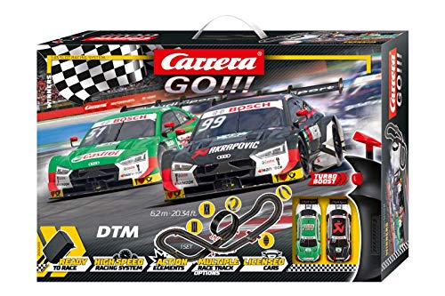 Im neuen Carrera GO!!! set „Winners“ – mit offizieller AUDI und DTM Lizenz – sorgen die neuen Modelle Audi RS 5 DTM „M. Rockefeller, No. 99″“ und Audi RS 5 DTM „N. Mueller, No. 51″“ für spannende „Kopf an Kopf““–Rennen. Wie das zweite Rennen in der DTM am Hockenheimring zeigt, hat Nico Mueller den ersten Platz ergattert, und Mike Rockefeller handkehrum wenige Sekunden später den 2. Platz. Schwarz gegen Grün heißt es nun auf der 6,2 Meter langen Rennstrecke bei Dir zu Hause im Wohnzimmer! Schlüpfe in die Rolle der berühmten Rennfahrer und zeige am Handregler, dass aka in Dir ein Champion steckt. Wenn Du mit Deinen Freunden die originalgetreuen Fahrzeuge im Maßstab 1:43 über die legendären Carrera Schienen flitzen lässt, ist actionreicher Spielspaß garantiert. Drücke den „Abgasturbolader-Button““ am kindgerecht designten Handregler und sichere Dir so zusätzlichen Speed und Deine Chancen auf den Sieg. So gelingt spielerisch der perfekte Einstieg in die Carrera Racing-Welt für alle Kind-Racer ab 6 Jahren.