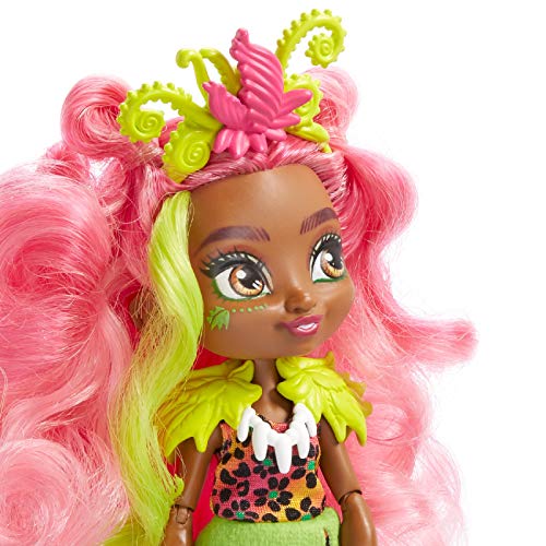 Die Cave Club Fernessa Puppe trägt ein neonfarbenes, buntes Kleid mit wildem Muster und Pflanzendetails, etwa eine Schärpe und Schulterstücke, die an Blätter erinnern