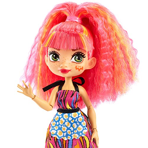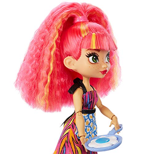 Die Emberly Puppe trägt eine Schürze über ihrem bunt gemusterten Kleid, und ihr leuchtend pinkfarbenes Haar ist zu einem coolen Pferdeschwanz hochgebunden
