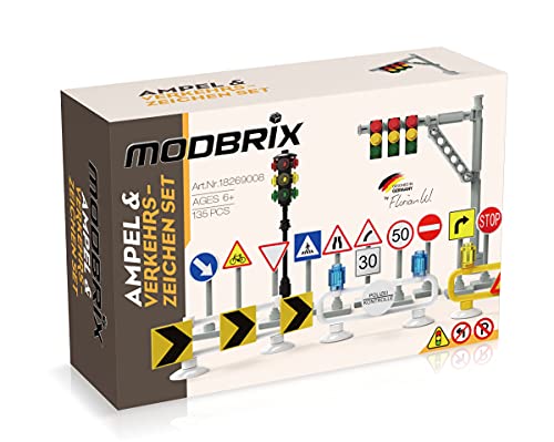Das Klemmbaustein Bauset besteht ganz 2 Ampelanlagen im Übrigen 13 bedruckten Verkehrsschildern.