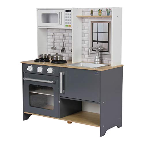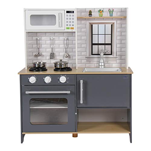 Unsere Spielküche Klara kommt in standfester Konstuktion und edler Durchführung handkehrum. Die Fronten im angesagten Farbton Anthrazit und die natürlichen Holzflächen machen die Küche zu einem wahren Hingucker.