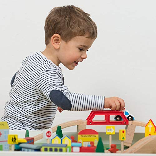 ÜBER 90 TEILE: Das Holzspielset enthält jede Menge Teile wie Züge, Autos, Straßen, Schilder, Häuser, Bäume und Brücken. Der Spieltisch ist damit vollständig ausgestattet und es
