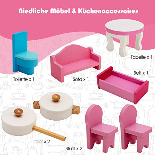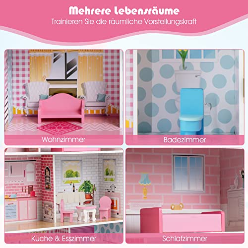 【3-stöckiges Puppenhaus】Das Puppenhaus ist in 3 Etagen unterteilt und verfügt über Wohnzimmer, Bad, Küche, Esszimmer und Schlafzimmer. Jedes Zimmer ist aufgrund der exquisiten Aufkleber farbenfroh. Darüber hinaus enthält dieses Spielhaus-Set 6 Möbelstücke, mit denen Ihre Kinder das Traumhaus mit ihrer Fantasie und Kreativität frei dekorieren können.