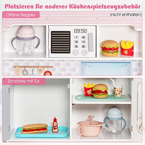 【Realistisches Kocherlebnis】Die Spielküche verfügt über eine Mikrowelle, Herde mit Schaltern, einen Wasserhahn, eine abnehmbare Geschirrspülbecken und 2 Töpfe. Durch Drehen der Herdschalter werden echte Klickgeräusche erzeugt, und es gibt auch realistische Lichter von den Öfen. Außerdem können Kinder ihre kleinen Spielsachen in den offenen Regalen oder in den Schränken aufbewahren.