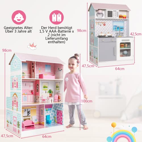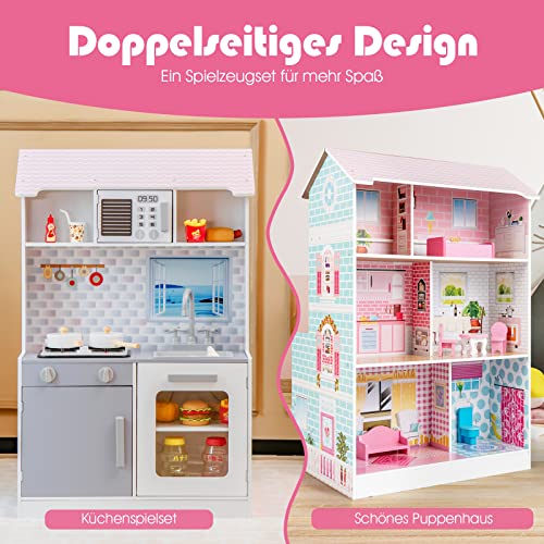 【Doppelseitiges Spielhaus für mehr Spaß】Dieses Spielzeugset mit zweiseitigem Design kombiniert ein Küchenspielset und ein hübsches Puppenhaus und sorgt für mehr Unterhaltung. Kinder können das Rollenspiel mit ihren Freunden auf beiden Seiten genießen, z. B. so tun, als würden sie Mahlzeiten kochen oder im Puppenhaus mit Puppen spielen.