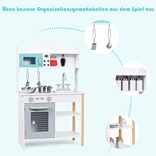 【Sicheres und unbedenkliches Material】Dank der Herstellung aus hochwertigen MDF-Platten und soliden Holzbeinen ist diese Spielküche vollkommen sicher und bietet Kindern eine lange Nutzungsdauer. Die Oberfläche der Küche wird mit schadstofffreier und umweltfreundlicher Farbe gestrichen, welche vollkommen geruchsfrei ist und Ihren Kindern eine unbedenkliche Spielfläche garantiert.