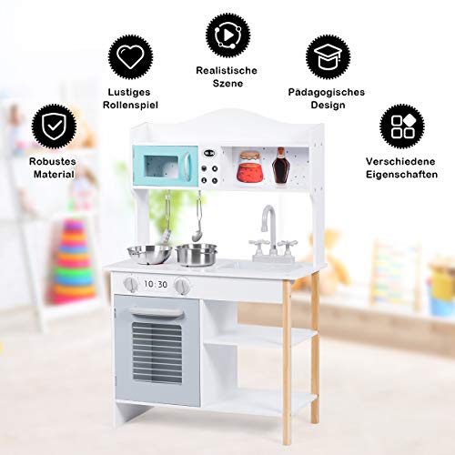【Sicheres und unbedenkliches Material】Dank der Herstellung sämtliche hochwertigen MDF-Platten und soliden Holzbeinen ist diese Spielküche vollkommen stabil und bietet Kindern eine lange Nutzungsdauer. Die Oberfläche der Küche wird mit schadstofffreier und umweltfreundlicher Farbe gestrichen, welche vollkommen geruchsfrei ist und Ihren Kindern eine unbedenkliche Spielfläche garantiert.
