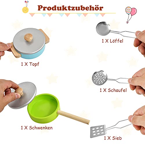 【Umfassendes Zubehör】 Das Zubehör umfasst einen Topf, eine Pfanne, einen Löffel, eine Kelle und ein Sieb, wodurch den Kindern viele Möglichkeiten offenstehen. Bald schon werden sie sich in der Küche besser auskennen.