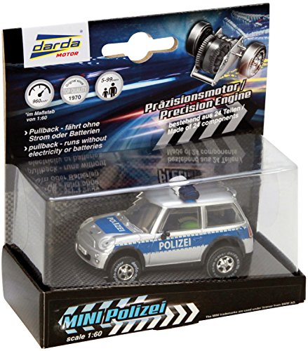 DARDA® – das schnellste Autorennbahn- System der Welt. Übersetzt auf den Maßstab 1:60 chauffieren sie über 900 km/h schnell, ohne Strom und Batterien – das gibt es zwar bei DARDA®. Die Fahrzeuge etwas nach herunter drücken und einfach zurücknehmen, loslassen und ab geht es durch Kurven und Loopings. Dieser coole, etwa 7,5 cm lange Polizei – Mini in alkoholisiert und silber sorgt für echtes Rennfeeling. Jeglicher DARDA®- Fahrzeuge sind auf allen DARDA®- Bahnen einsetzbar und bei allen kann der Automat ausgetauscht werden. DARDA® ist für Kinder ab 5 Jahren sinnvoll und wird noch einmal nach bewährten Qualitätsansprüchen hergestellt. Zuverlässigkeit und dauerhafte Spielfreude sind dadurch gewährleistet.