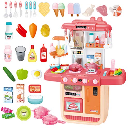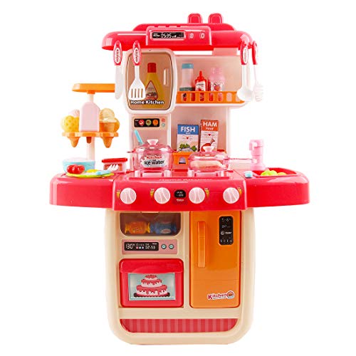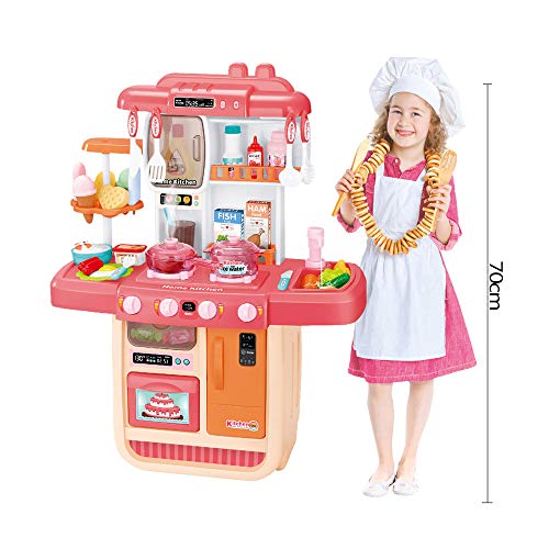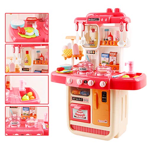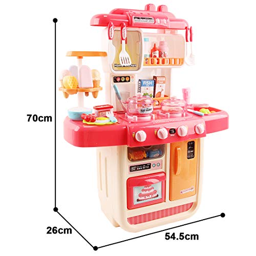 deAO Küchenset Mein kleiner Chef mit 34 Zubehörteilen, Induktionskochfeld, Wasser, Licht und Sound (Rosa)