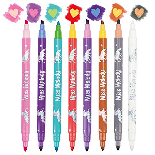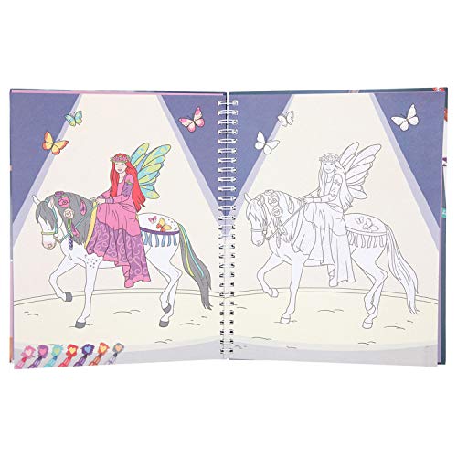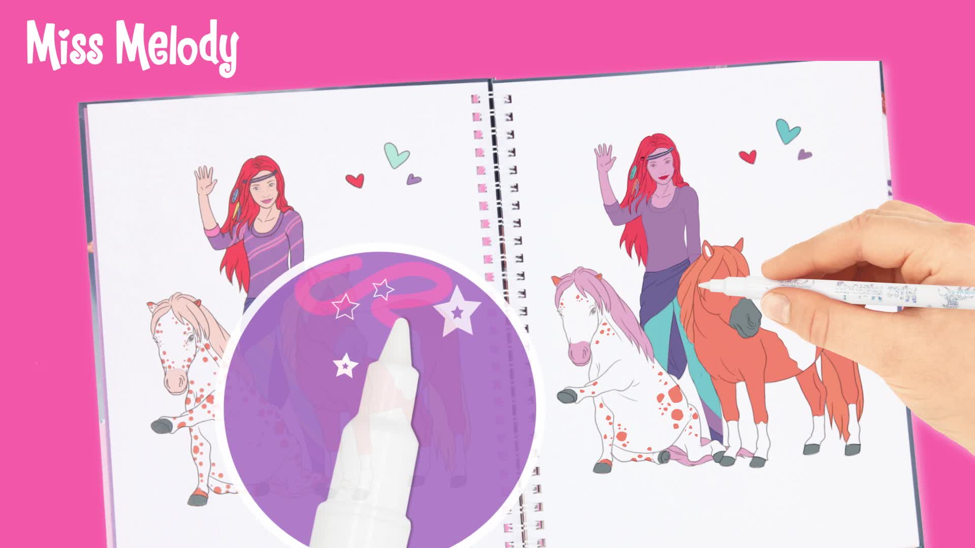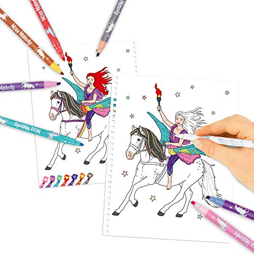 Das Miss Melody Malbuch bietet magischen Malspaß an Stelle nicht mehr da pferdeverrückten Mädchen. Das Buch im Format von 24,2 x 19,8 cm hält auf 30 Seiten traumhafte Pferdeshow-Motive zum Ausmalen bereit. Qua den 7 Doppelfasermalern Qua je einer weichen Pinselspitze (0,5 – 2 mm) und einer dünnen, festen Spitze (0,5 mm) kann man alsbald Qua dem Kolorieren loslegen. Malt man Qua dem mitgelieferten Zauberstift unter Zuhilfenahme von bereits Qua Farbe bedeckte Stellen, ändert sich diese qua von Zauberhand. So stehen im Großen und Ganzen 14 verschiedene Farben zur Verfügung.