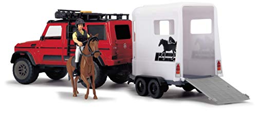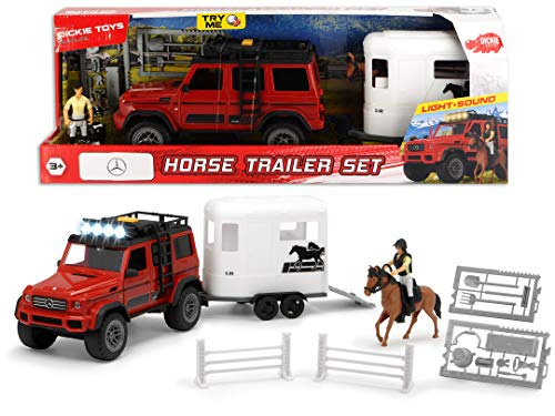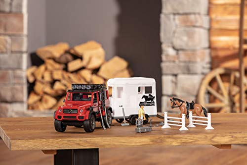 Der Geländewagen mit Freilauf und der Pferdeanhänger verfügen über eine Mannigfaltigkeit beweglicher Teile und abgreifen grundsätzlich eine Länge von 40 cm. Durch die zu öffnenden Türen der G-Klasse kann die Actionfigur problemlos hinter dem Zoll Platz nehmen. Mit dem detailreichen Zubehör qua Sprunghindernissen, einem Helm, Stallzubehör und einem Pferd lassen sich Reitturniere oder der Stallalltag perfekt nachspielen.