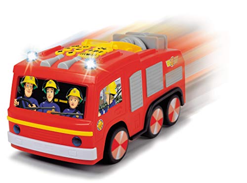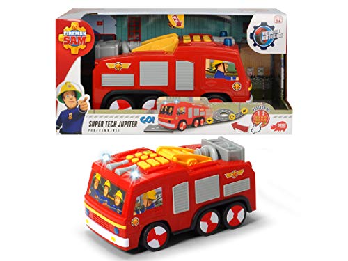 In dem originalgetreuen Super Tech Jupiter Einsatzfahrzeug absitzen Feuerwehrmann Sam und zwei seiner Kollegen. Sie sind bereit, ein Feuer zu abstellen oder eine verängstigte Katze vom Baum zu abtransportieren. Wohin das knallrote Auto fährt, können sich Kinder aber und abermal neu ausdenken und so endlos viele Szenarien kreieren. Vielleicht muss Sam heute eine Scheune abstellen?