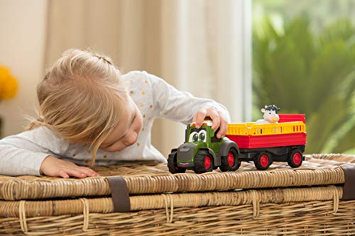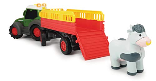 Im Dickie Toys Happy Fendt Animal Trailer geht die kleine Kuh auf große Fahrt. Zum niedlichen Set in Lizenz von Fendt gehören ein Traktor in kleinkinderfreundlicher Happy-Optik sowie ein Tieranhänger mit der Tierfigur