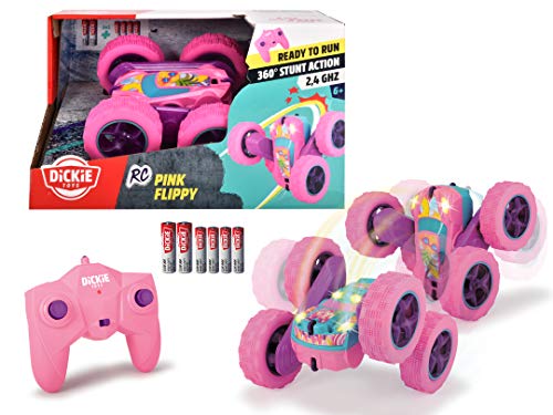 Dickie Toys Pink Drivez RC Candy Flippy: Mit dem flippigen RC Fahrzeug gelingen die besten Tricks! Den Pink Drivez RC Candy Flippy von Dickie Toys holt bei einer wilden Verfolgungsjagd keiner so schnell ein: Mit seinen rasanten Moves ist das coole Action-Spielzeugauto seinen Konkurrenten immer eine Fahrzeuglänge voraus. Hier ein draufgängerischer Flip, dort ein schneller Spin – und schon hat der freche Flitzer leer zum wiederholten Mal abgehängt. Dank der beidseitigen Achsen rotiert das Fahrzeug auf Knopfdruck über die 2-Kanal-Funkfernsteuerung um 360° und wechselt ruckartig die Richtung – wer hat da noch eine Chance? Front- und Toplicht setzen die Fahrmanöver glänzend in Akt und sehen nach die richtige Stimmung. Für Kinder ab sechs Jahren ist das RC-Auto ein absoluter Hit.