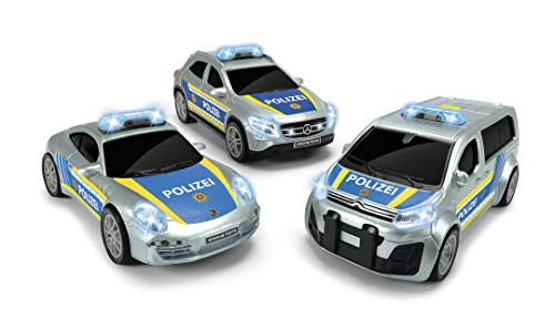 Mit der Dickie Toys Police-Unit-Kollektion entdecken Kinder ab drei Jahren eines von drei verschiedenen Polizeiautos, die beliebte Fahrzeugmodelle detailverliebt im Maßstab 1: 32 vorzeigen.