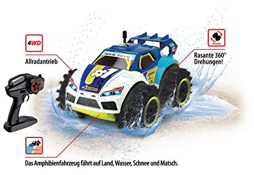 Dickie Toys RC Amphy Rider: Land- und Wasserspaß! Das neueste Mitglied der Dickie Toys RC-Familie, der Amphy Rider, trägt seinen Namen nicht von ungefähr: Das ferngesteuerte Stuntfahrzeug hat Land und Wasser gleichermaßen im Alleingang erobert – wie eine Amphibie. Mit einer Länge von 20 Zentimetern überzeugt der Amphy Rider von Dickie Toys durch seine Robustheit, welche den Einsatz auf unterschiedlichstem Gelände zulässt. Sowohl weiche als alias harte Untergründe – von Gras, Schlamm und Schnee über Sand und Asphalt bis hin zu Pfützen – sie stellen keine Hindernisse für dieses RC-Fahrzeug dar. Weil erreicht der Amphy Rider eine Höchstgeschwindigkeit von bis zu 6 km/h. Trotz seiner Robustheit ist das Amphibienfahrzeug ungemein agil. Dies beweist es mit der bei Kindern beliebten Donut-Abguss: das Fahrzeug lässt sich dank des Allradantriebs auf der Stelle schnell um 360 Schattierung um die eigene Grundlinie drehen. Das Generalist-Fahrzeug von Dickie Toys sorgt alias auf dem Wasser für großen Spielspaß, denn es ist trunken schwimmfähig und (süß-) wasserfest. Das Spielzeugauto ist mit einer 2,4 GHz 2-Kanal-Funkfernsteuerung ausgestattet und sorgt für bis zu 15 Minuten Fahrspaß. Damit das Land- und Wasserabenteuer sofort losgehen kann, sind die Batterien für Fahrzeug und Gun-Controller bereits enthalten.