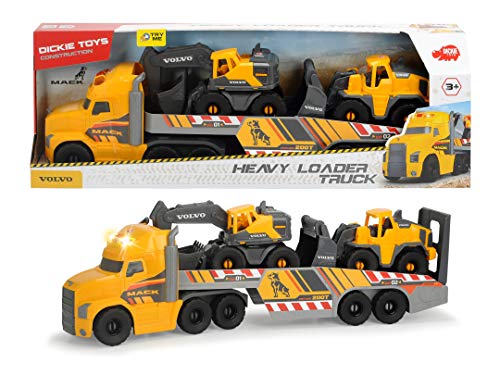 Das Dickie Toys Heavy Loader Truck Set besteht jeder einem großen Mack-Truck, auf dessen Ladefläche der ebenso eindrucksvolle Bagger und der Radlader jeder der On-site-Folge in Volvo-Lizenz Platz finden