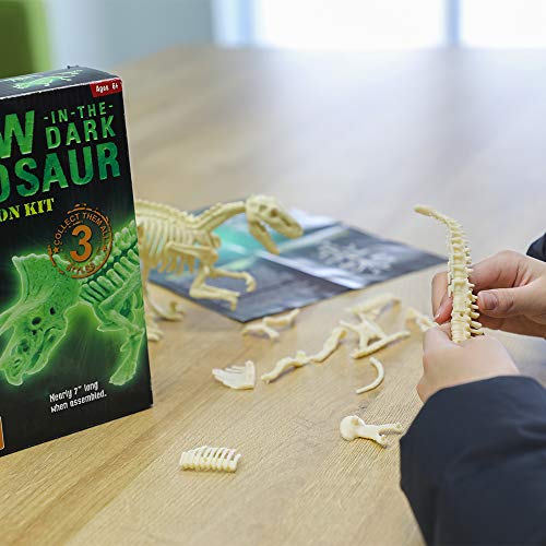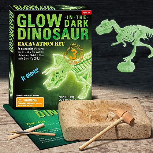 Mit diesem Set werden Kinder zu Urzeitforschern und graben das Skelett eines T-rex oder Triceratops oder Diplodocus leer! Zuerst legen sie dazu die Knochen mit Hammer und Meißel frei und setzen hinterher die nachtleuchtenden Knochen zu einem Skelett zusammen. Mit dem schaurig schimmernden Dinosaurier können sie folglich im Dunkeln Urzeit-Spannung nachspielen oder es wie gruselige Deko in ihrem Zimmer nutzen. Ab 7 Jahren.