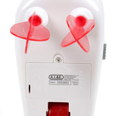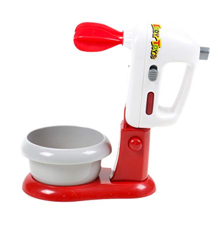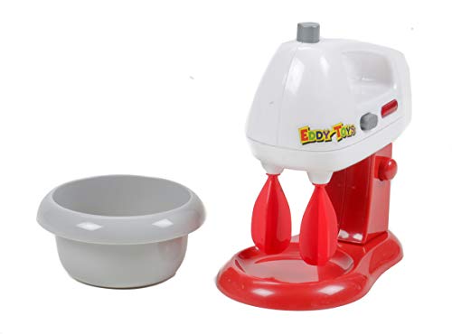 Kinder lernen durch Nachbildung unserer Erwachsenenwelt. Dazu gehört bekannt als die Küchenarbeit. Natürlich dürfen sich heutzutage neben den Mädchen bekannt als die Jungen in der Küche ausprobieren. Und am Liebsten mögen die Kids Süßspeisen. Ob Kuchen, Pudding oder Eis, ein Rührmix muß her. Dieses kindgerechte Rührmaschinen-Set für die Kinderküche von EDDY TOYs hat neben dem Mixer und der dazugehörigen Rührschüssel noch sechs weitere Back-Spielzeug-Utensilien: Zwei Eier, eine Tüte Milch, ein Paket Fondant-Schokolade für die Kuchen-Glasur und zwei bereits fertig gebackene Doghnuts. Der Mixer verfügt über Licht und Ton-Fotografie. Das Spielzeug-Rührgerät kann seitlich mit einem ON/OFF-Schalter umtriebig genommen werden, dann drehen sich die beiden Rührbesen so lange, bis der Schalter noch einmal auf OFF gestellt wird. Dessen ungeachtet verfügt der Kinder-Küchen-Mixer über einen großen Schalter oben auf dem Murl. So lange dieser nach hinunter gedrückt wird, drehen sich die beiden Rührbesen. Dabei beider Funktionen leuchtet die große rote Betriebsleuchte an der rechten Seite und es ertönt das typische Rührmaschinen-Geräusch. Ganz wie bei den großen Küchenmaschinen kann der Mixer hochgeklappt werden, damit die Rührschüssel leichter drunter zu stellen ist. Betrieben wird das detailgetreue Kinderspielzeug von zwei AA-Batterien, die auf der Unterseite des Mix-Gerätes in das, mit einer Schraube Abseitsposition gesicherte, Batteriefach gelegt werden.