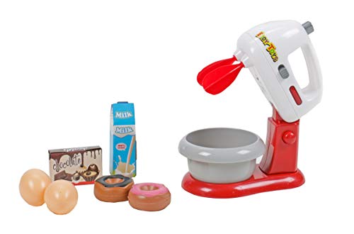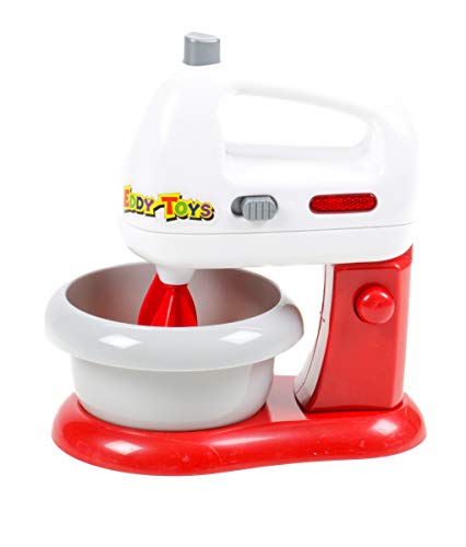 Nebenbei ertönt das typische Rührmaschinen-Geräusch. Der Mixer kann hochgeklappt werden, damit die Rührschüssel leichter drunter zu stellen ist. Betrieben wird das detailgetreue Kinderspielzeug von zwei AA-Batterien