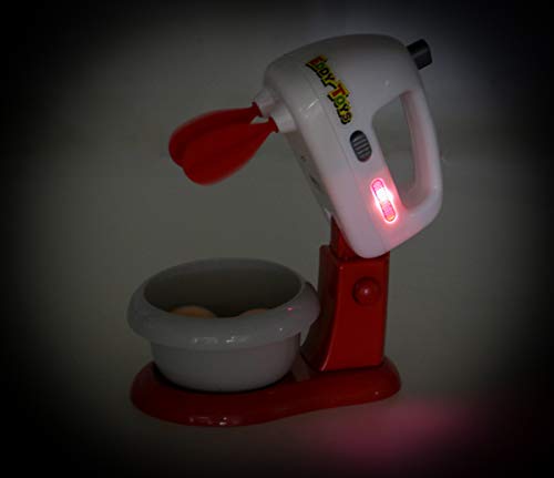 Diese kindgerechte Rührmaschine für die Kinderküche hat neben dem Mixer und der dazugehörigen Rührschüssel noch sechs weitere Back-Spielzeug-Utensilien. Der Mixer für Kinder verfügt über Licht und Ton-Fotografie