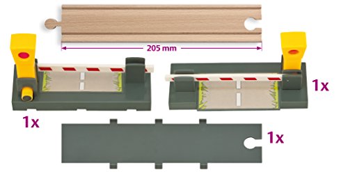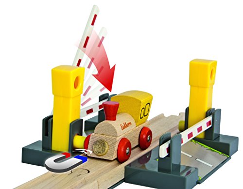Eichhorn Bahn, Übergang: Eine tolle Anhang für eine Bahnstrecke ist der Bahnübergang, deshalb die Fußgänger und Autos leistungsfähig die Schienen überqueren können. Die Schranken besitzen eine Magnetfunktion und derivieren automatisch. Verbaubar mit Brio und anderen Schienenbahnsystemen. Für Kinder ab 3 Jahren passend.